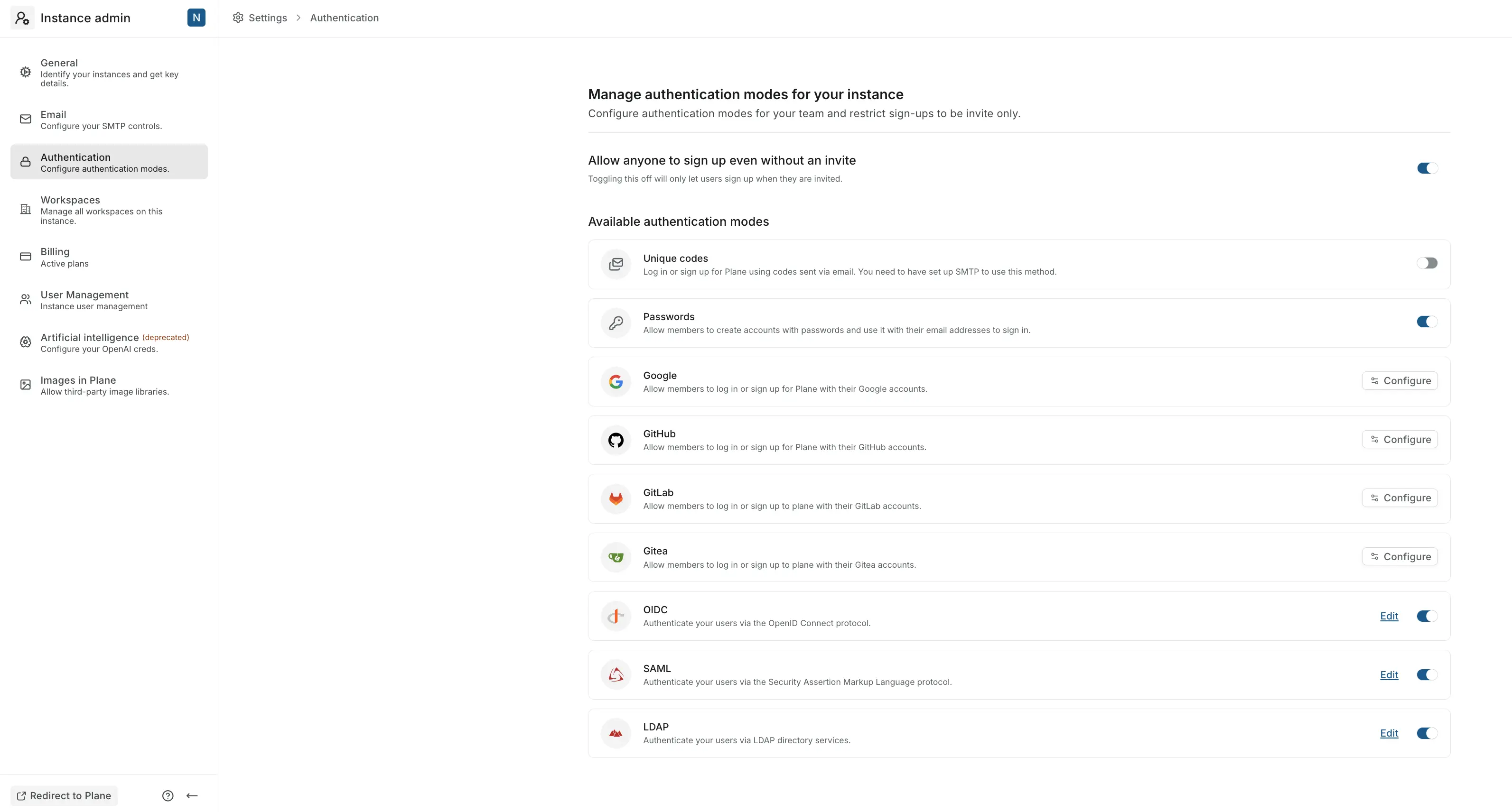 Control what SSO and OAuth services your users can use to sign up and log in to your Plane instance. You can also toggle unique code and password logins on and off from here. Learn more here.