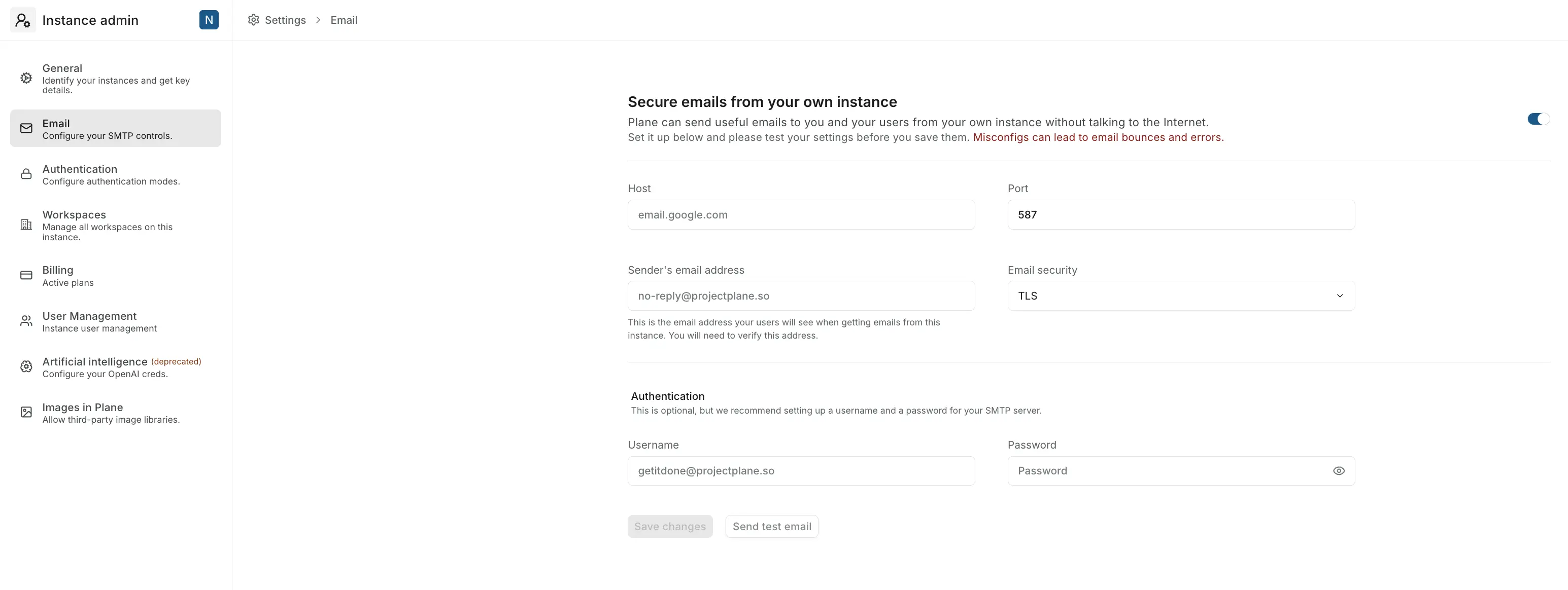 Set up your SMTP server here so you can send essential emails—password resets, exports, changes to your instance—and Plane-enabled emails—onboarding, tips and tricks, new features— to all your users. Learn more here.