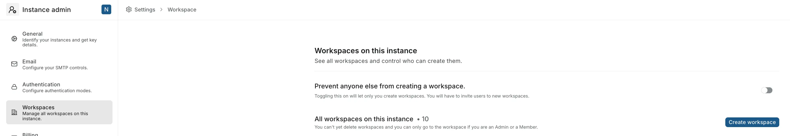 Toggle the Prevent anyone from creating a workspace option to prevent anyone else from creating workspaces. Once enabled, only you (the instance admin) can create new workspaces.